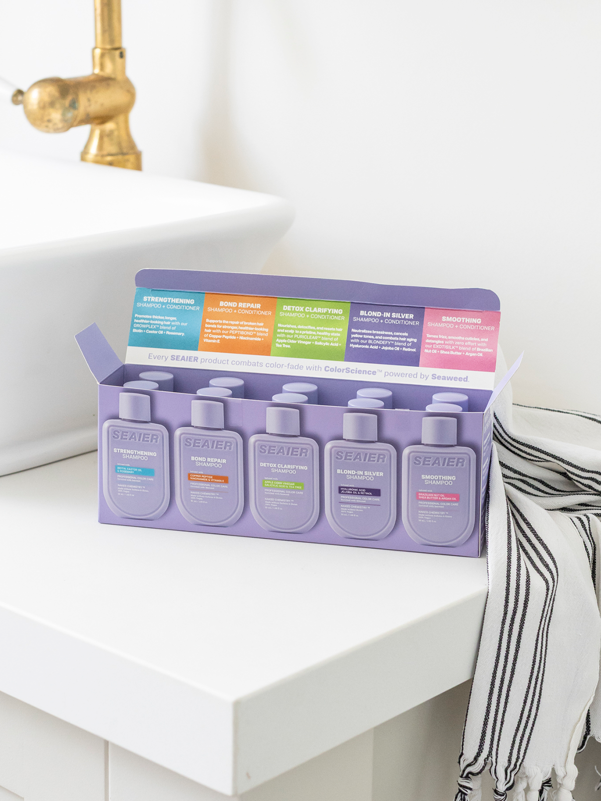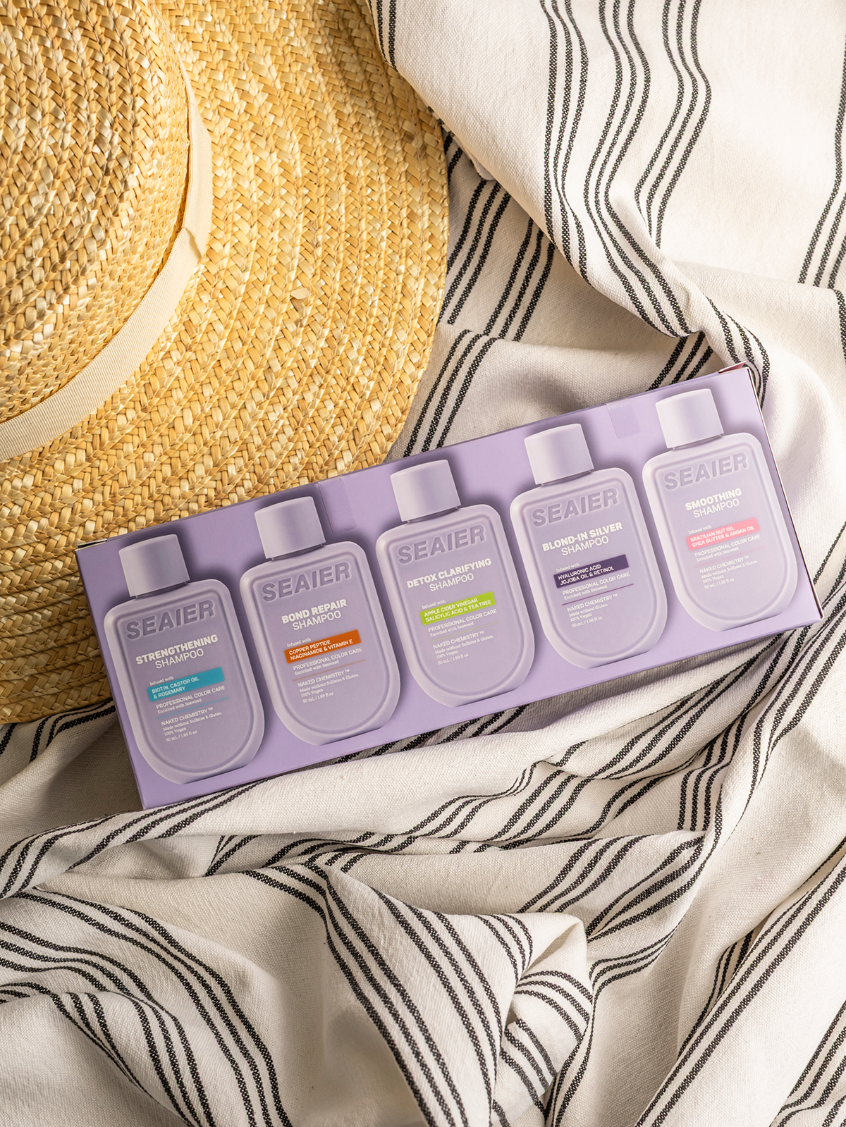 The ultimate way to experience all five Seaier ranges in one convenient kit. Each mini shampoo and conditioner duo is perfectly sized for travel, giving you salon-quality haircare on the go.